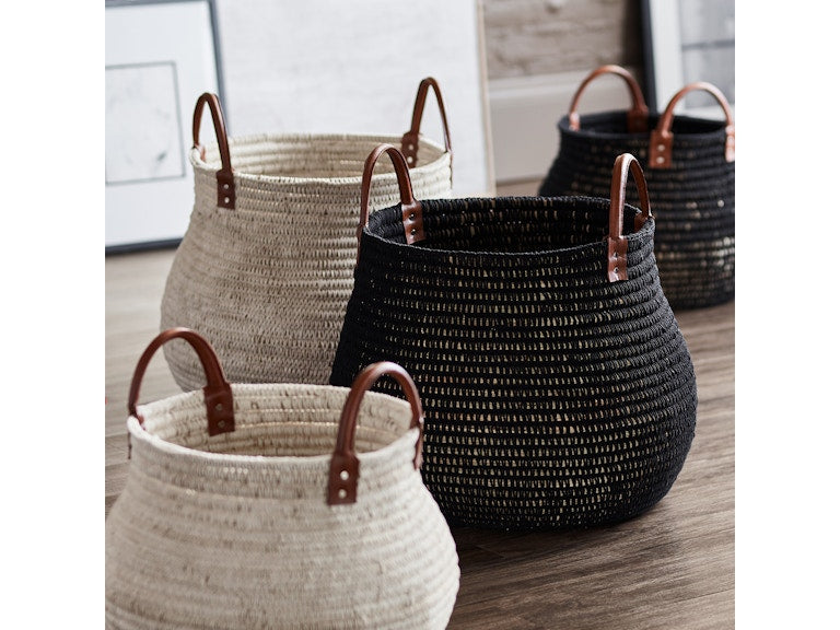 Natural seagrass frame in a coil weave design with hand-wrapped white cotton and large leather handles.