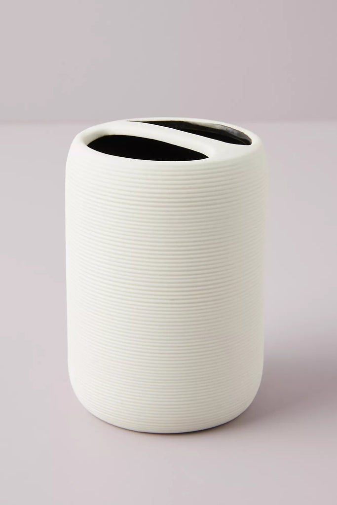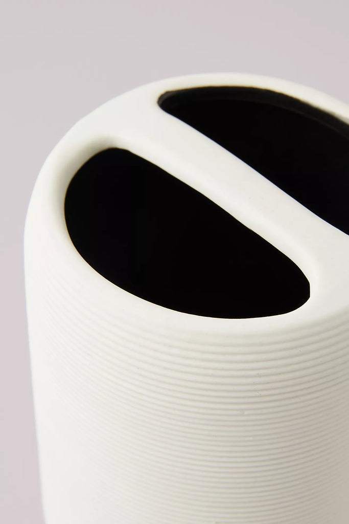 Crafted from porcelain, the Fillmore Bath Accessories feature a ribbed texture. Ivory on the outside and black on the inside, this accessory achieves the ultimate modern look.