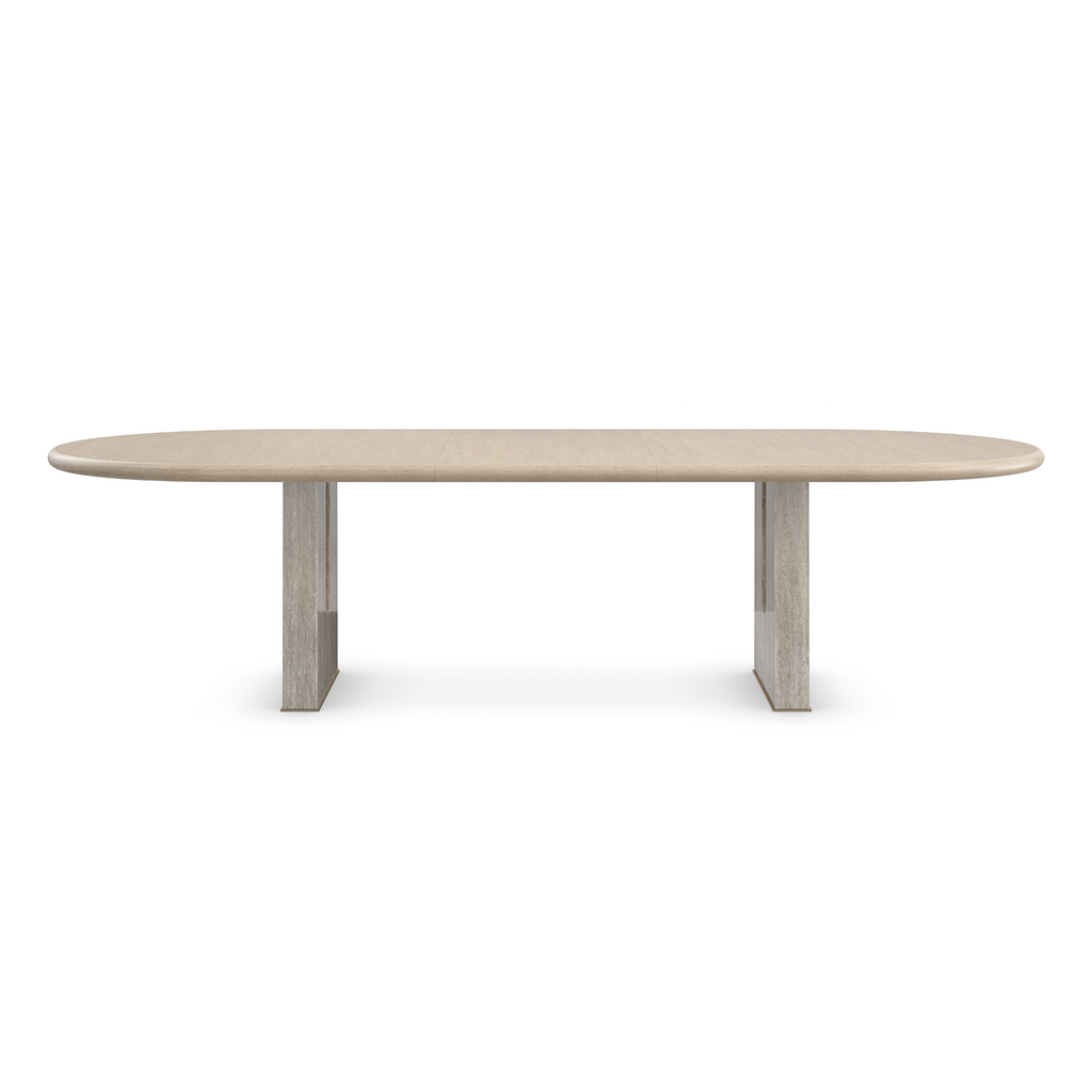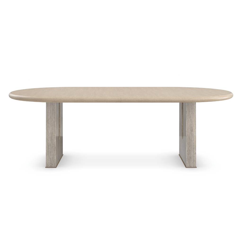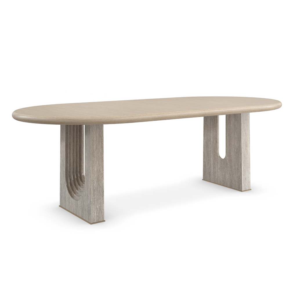 A modern design staple, this extension dining table makes use of intricate details to add emphasis and make a statement. An elegant, oval top in Sun Drenched Oak offers ample room for guests to intimately gather. Drawing the eye: parsons-style legs with dramatically stepping arches, meticulously crafted in Silver Travertine stone and trimmed in Lucent Bronze Metallic metal.