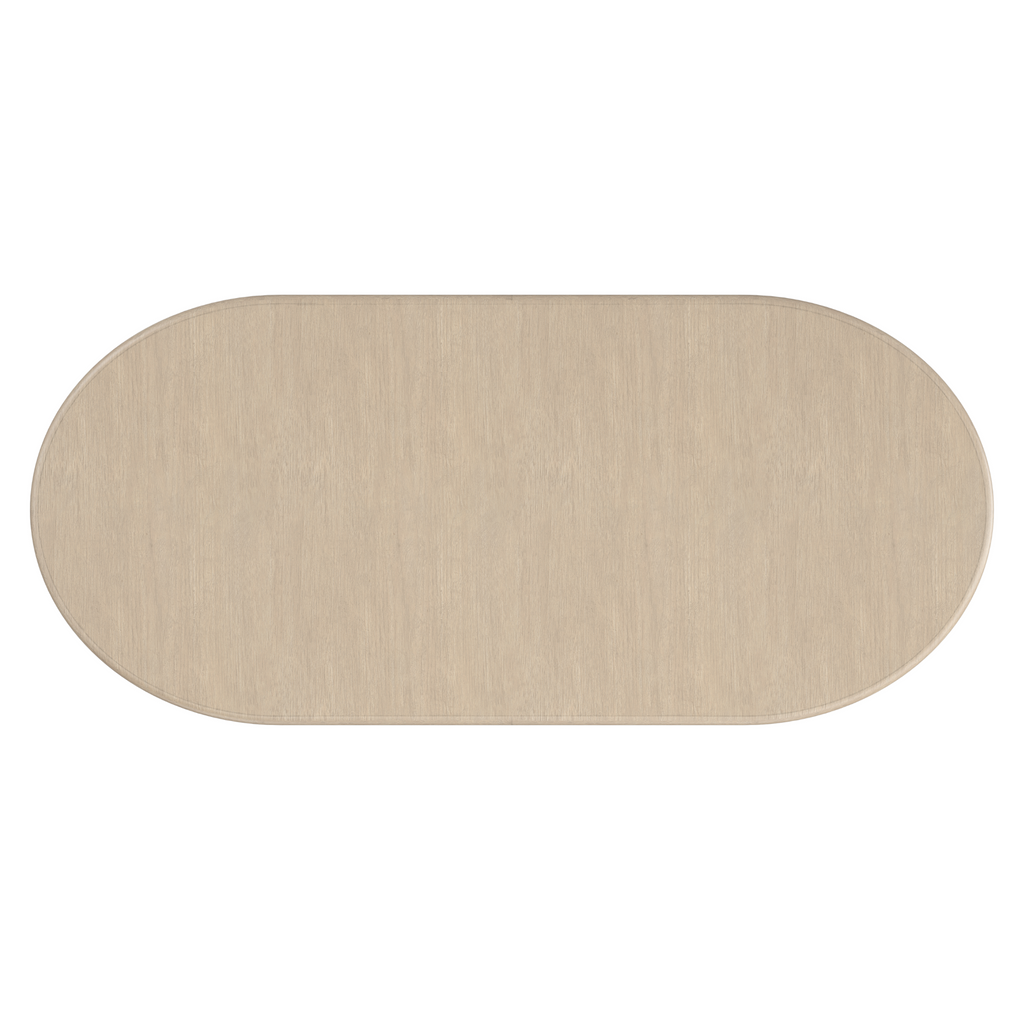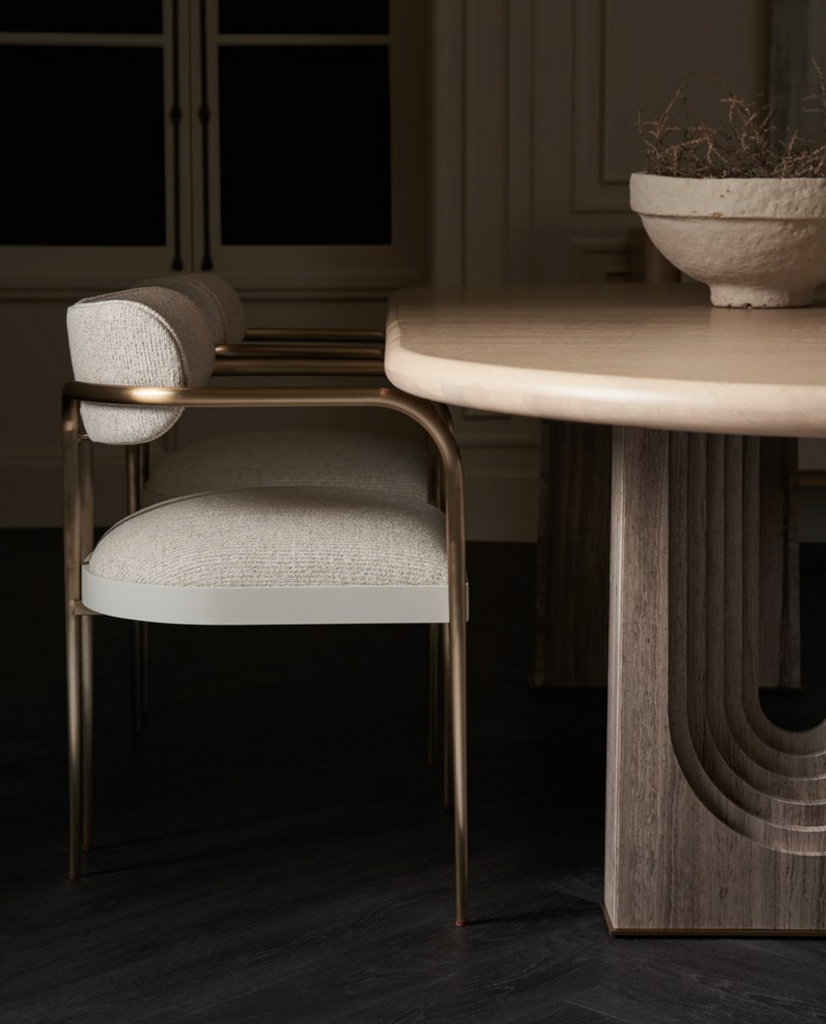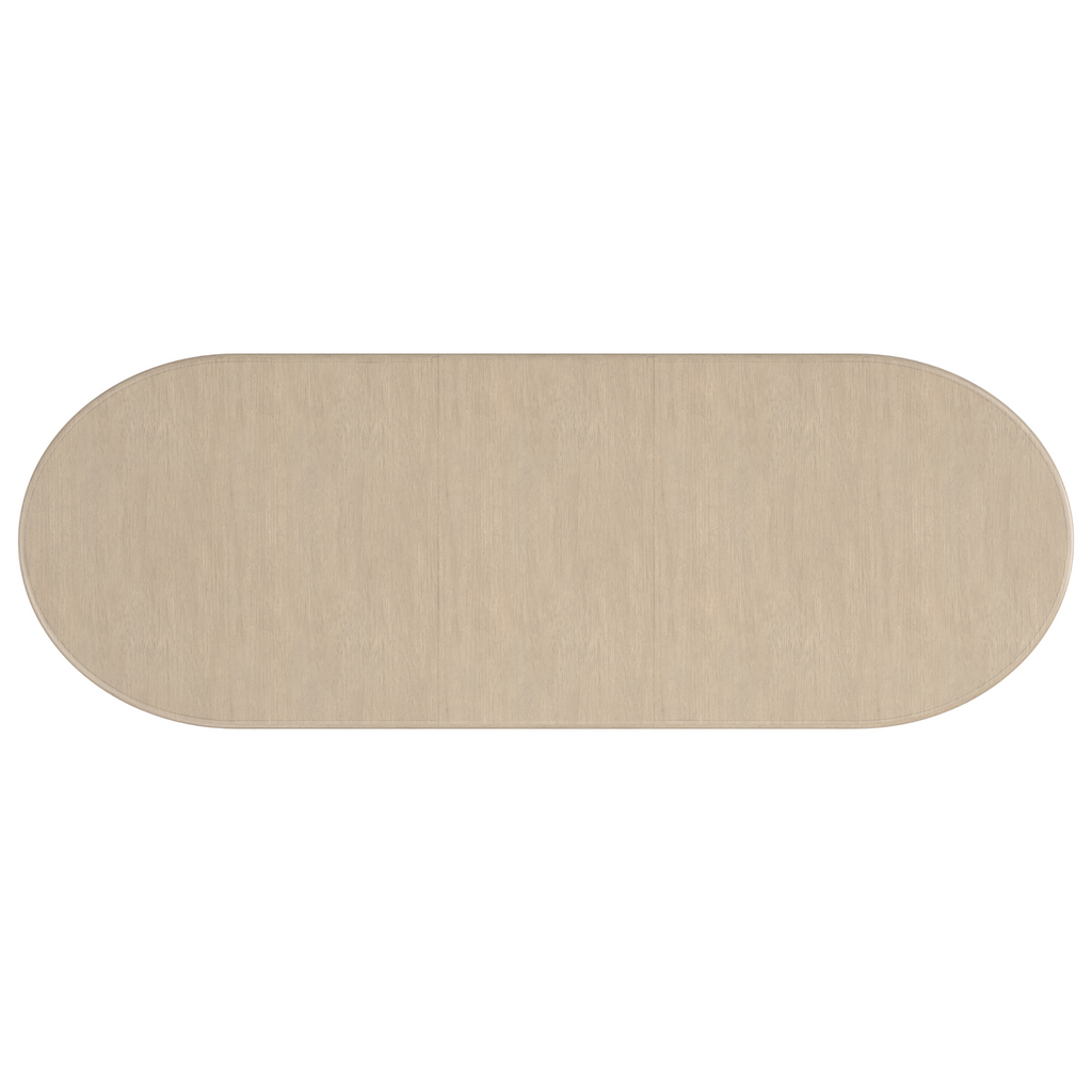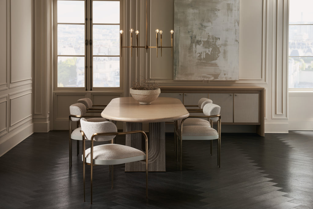 A modern design staple, this extension dining table makes use of intricate details to add emphasis and make a statement. An elegant, oval top in Sun Drenched Oak offers ample room for guests to intimately gather. Drawing the eye: parsons-style legs with dramatically stepping arches, meticulously crafted in Silver Travertine stone and trimmed in Lucent Bronze Metallic metal.