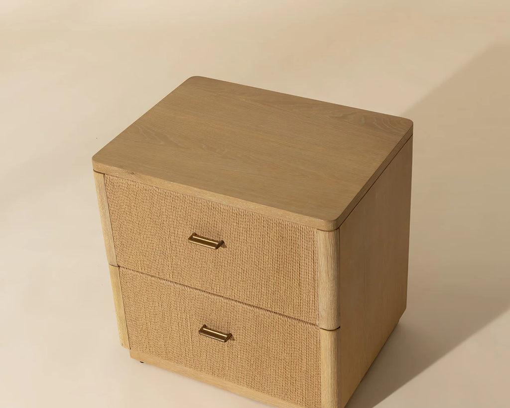 SunPanThe Etienne Nightstand boasts a linear profile with a warm design. Constructed from a rustic oak veneer with solid oak wood legs and a matching rope covering on the doors. Antique brass handles complement the piece. As wood is an organic, porous material, these pieces will contain natural variation of texture and may also exhibit fine indentations and cracks. Wood pieces will also display a disparity of colour and grain, and visible knots and burls that add to the character of each piece.